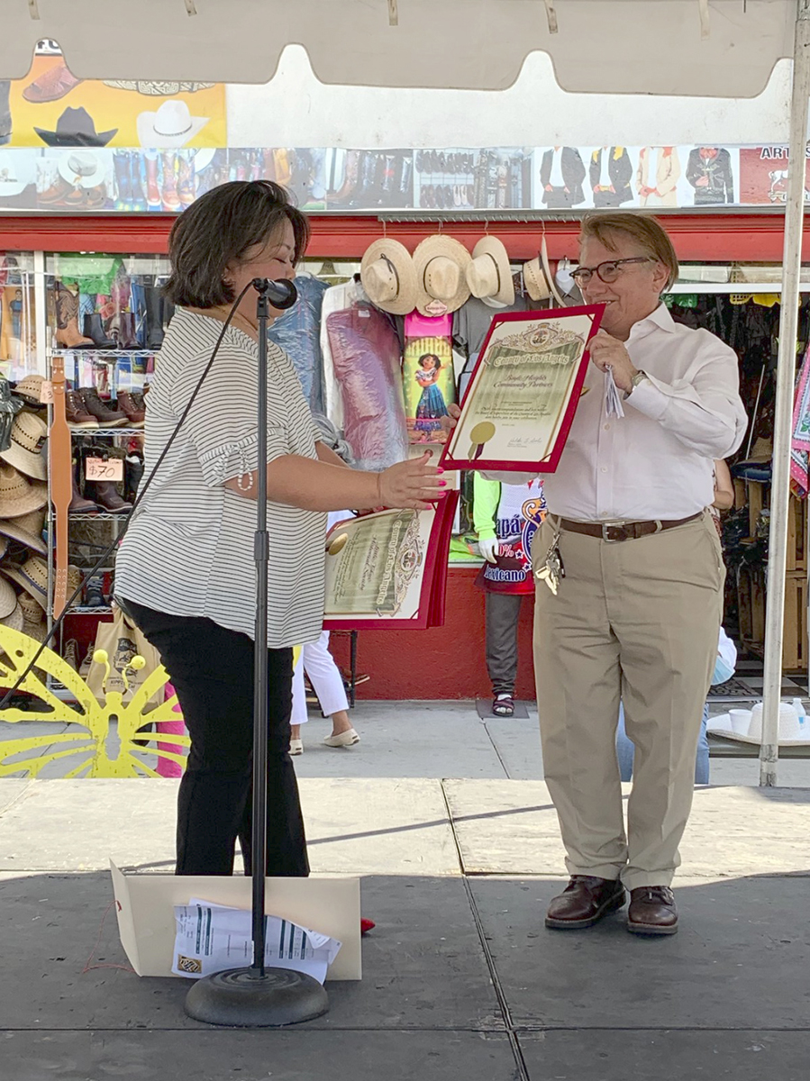 Hilda Solis's Sr. Budget Deputy Tami Omoto-Frias hornoring Vivian Escalante with a Certificates of Commendation for their work in highlighting the rich history of the Japanese American community in Los Angeles. Photo by LTHS
