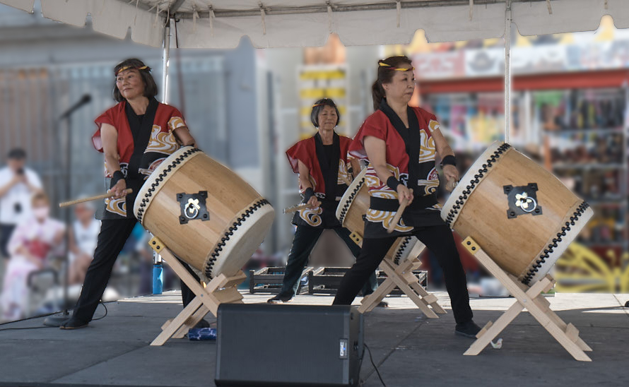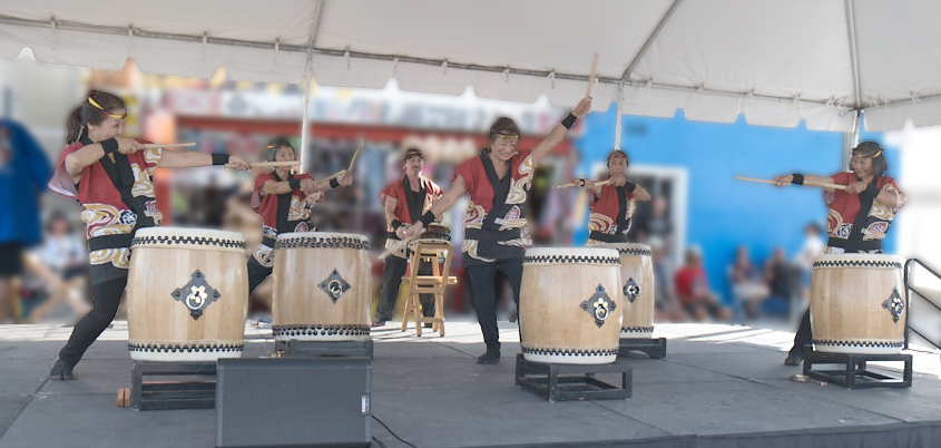 Hikari Taiko Drumeers Association of America with Roosevelt High School Alumni Joyce Kawahata in the center. Photo by Douglas